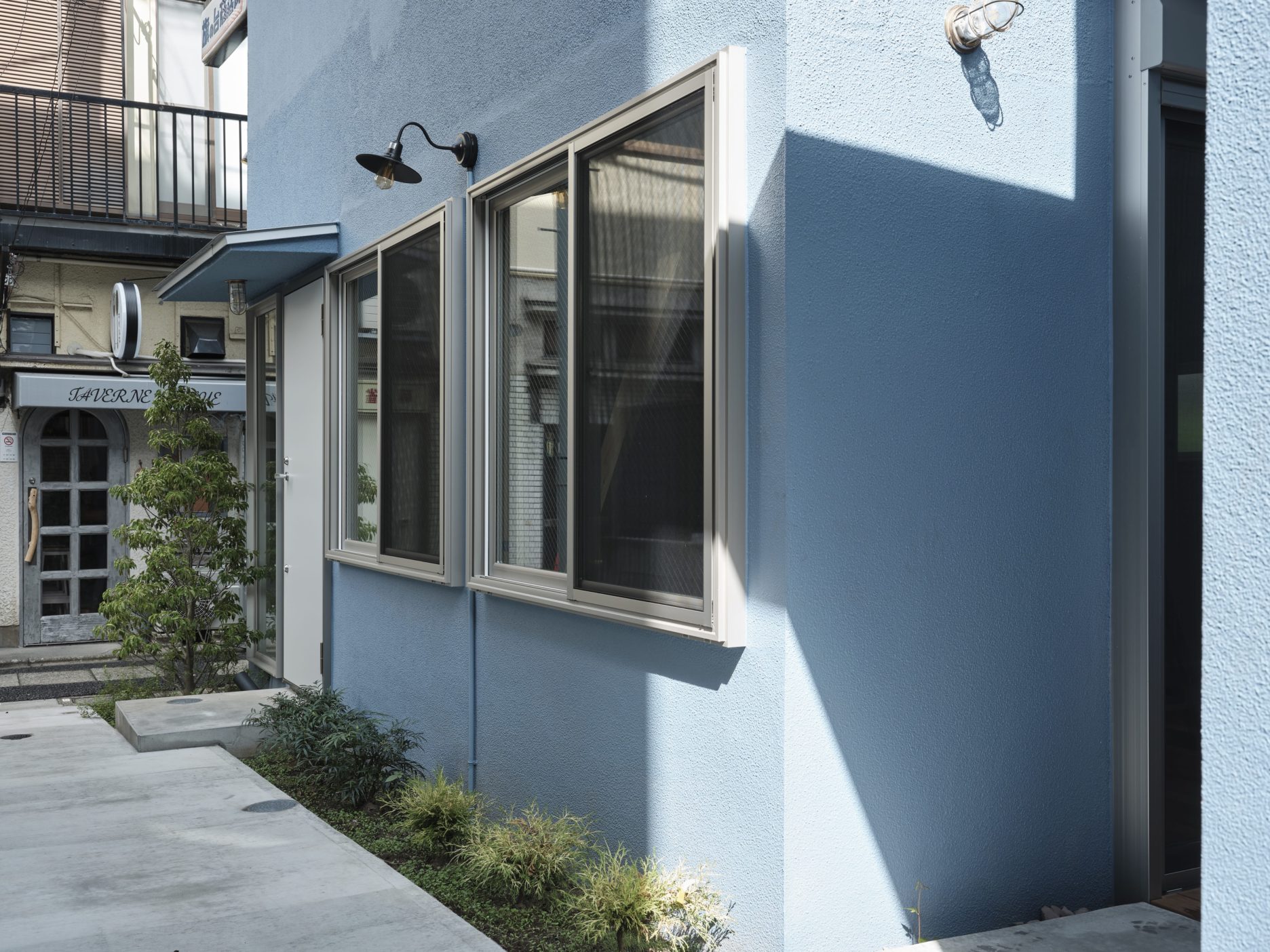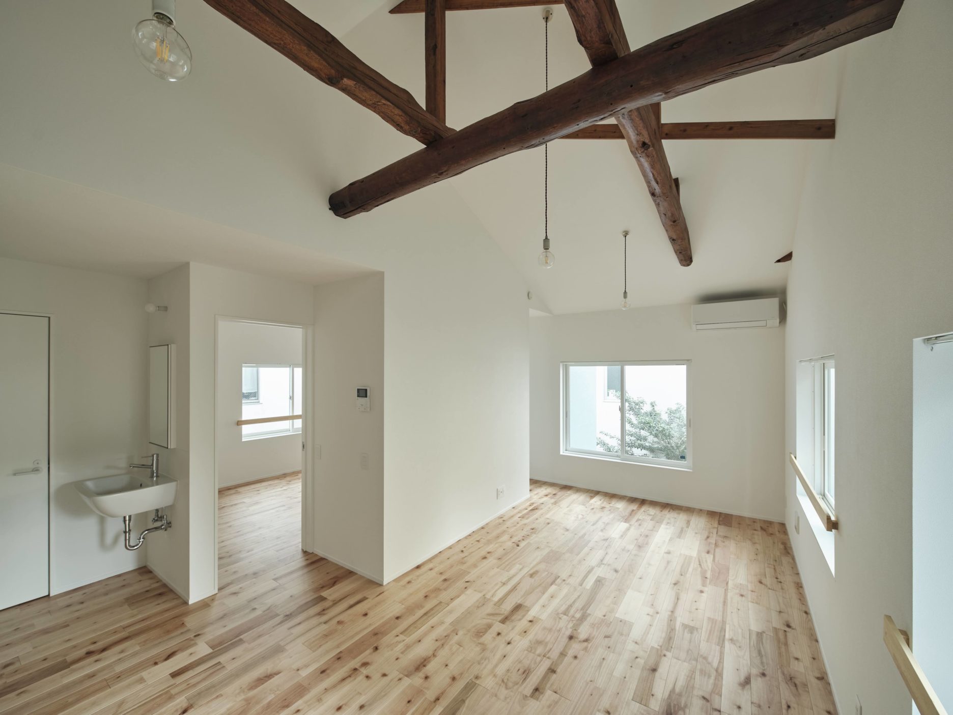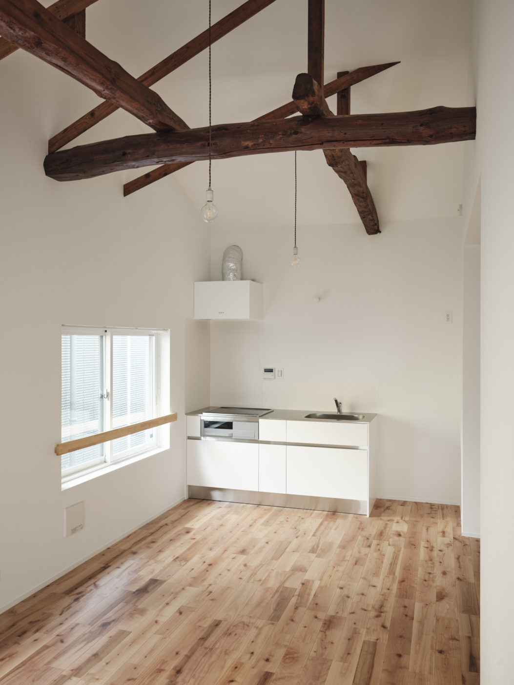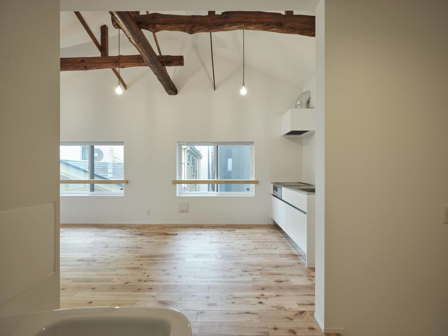 それまでは1棟は風呂無し3畳の共同住居、もう1棟は階で分かれた長屋として活用されていた住居をほぼスケルトンに解体し、基礎を含めた耐震補強と断熱補強を行いつつリノベーション。都内駅前で不足しているファミリータイプの面積の賃貸と、1階を店舗に生まれ変わらせた。