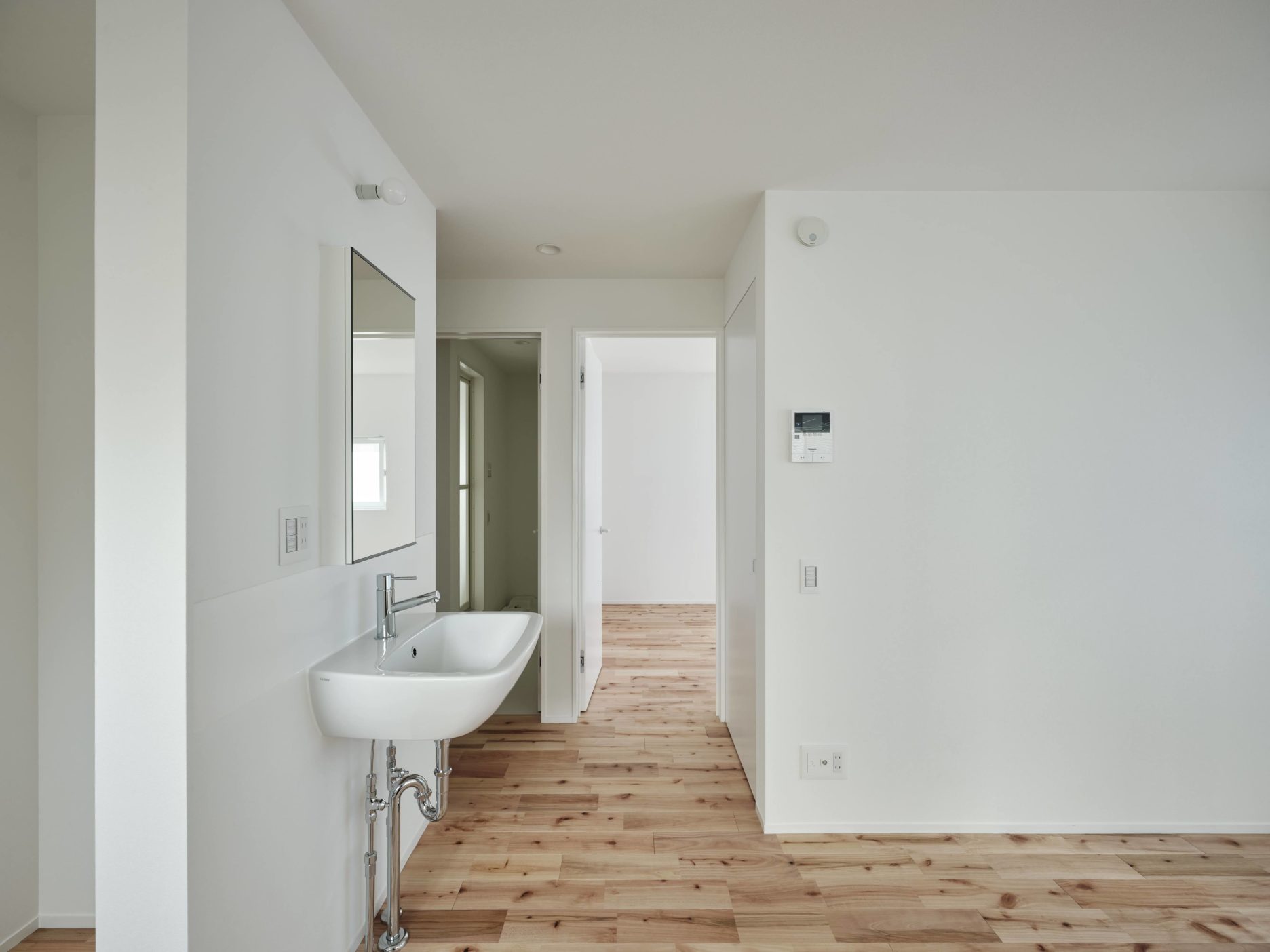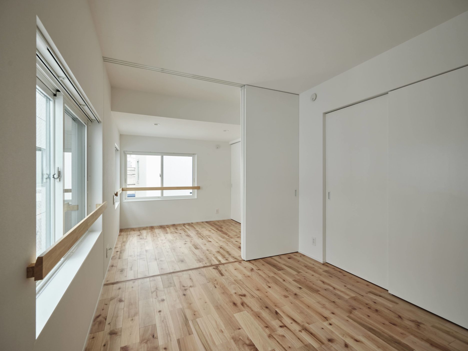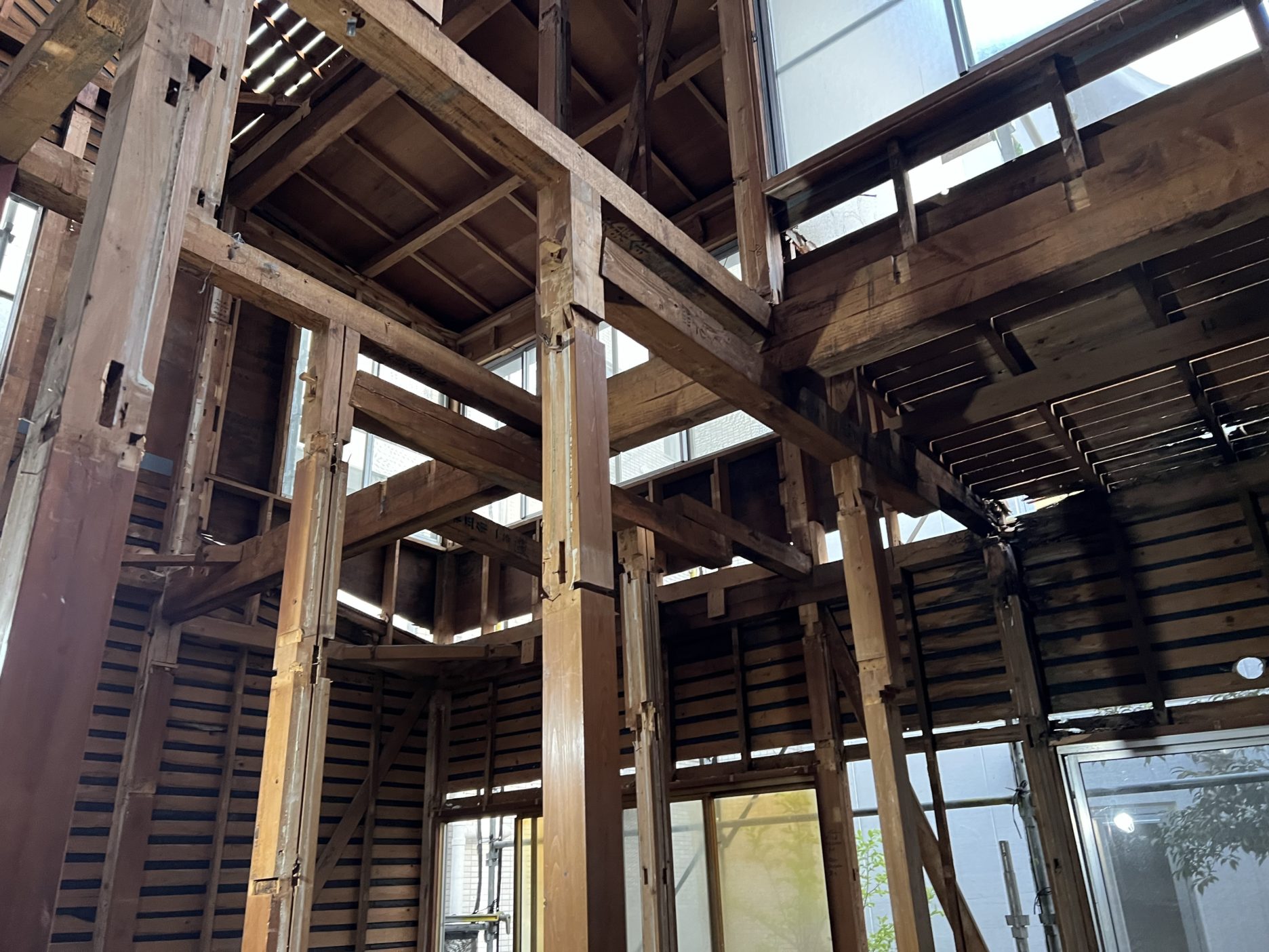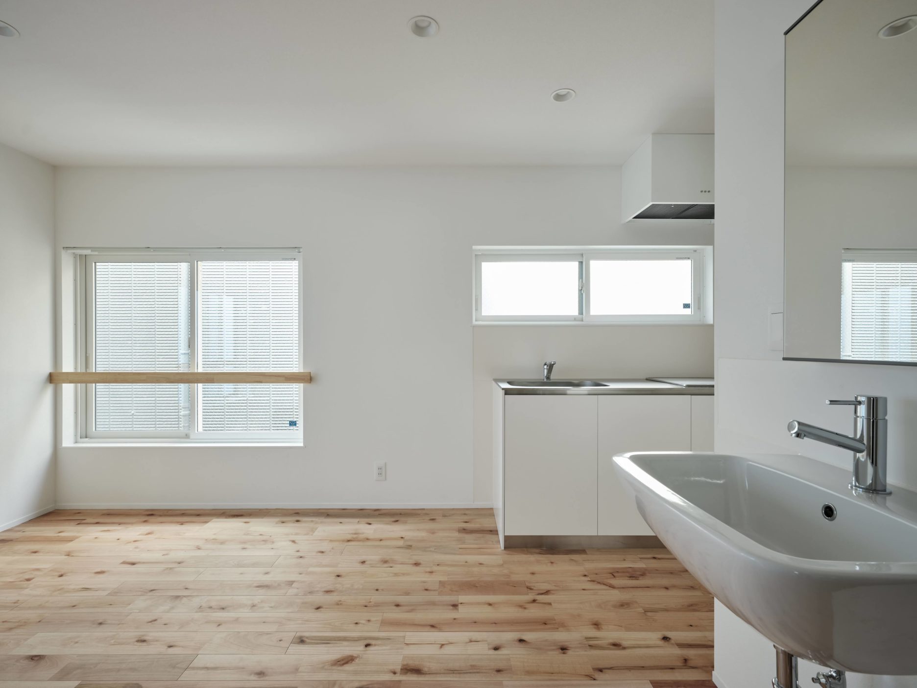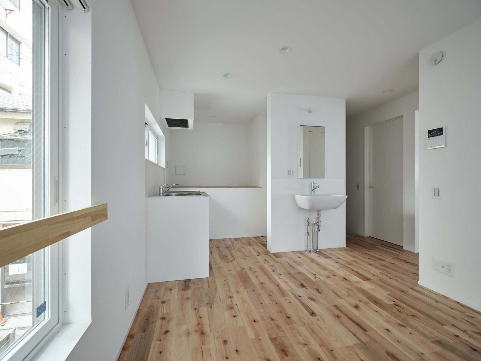 それまでは1棟は風呂無し3畳の共同住居、もう1棟は階で分かれた長屋として活用されていた住居をほぼスケルトンに解体し、基礎を含めた耐震補強と断熱補強を行いつつリノベーション。都内駅前で不足しているファミリータイプの面積の賃貸と、1階を店舗に生まれ変わらせた。